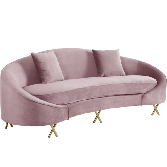 Beautify your event with this pristine Oasis Sofa Blush. Upholstered with plush pink velvet, it’s soft to the eye and soft to the touch. Its shape and design are exquisitely unique with the X gold legs giving this dainty couch an added touch. Also available as a loveseat.