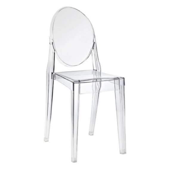 An all-time favorite and classic. The popular, enchanting Victoria Dining Chair of French design has a transparent, sleek appearance that compliments affairs of any color or style. Made of acrylic, this chair is comfortable and durable, making it a great choice for hosting a party. Available in clear, smoke and white.