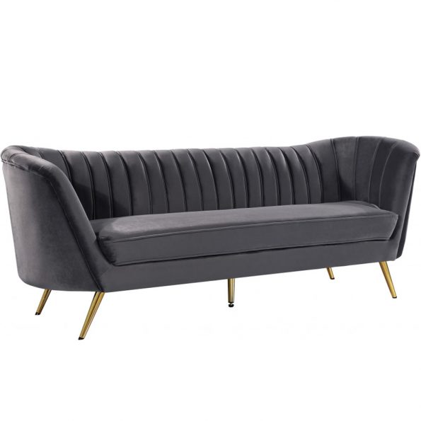 Bring exquisite design and supreme comfort together with the Arbow Sofa Gray. The royal, lush velvet with line tufting, brings you a stylish lounge feel. It features a curved back that continues on the sides as armrests, on contrasting gold legs that add an extra touch of style. Available in black, blush, cognac, cream, gray, green and navy and as accent chairs, chaise longues and loveseats.