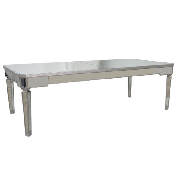 The royal Bedford Dining Table is not just a mirror table. This sleek silver mirror table has intricate designs with silver trim framing the mirror panels. The table features exquisite tapered legs and a polished mirror presence, creating a majestic ambiance.
