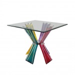 Add some color and flair with the Colored Glass Cocktail Table Square. It features an elegant glass tabletop displaying it’s unique colored glass base of yellow, red, purple and green legs together. Great for elegant events or fun parties. Available in in cocktail round, cocktail square and round dining table.