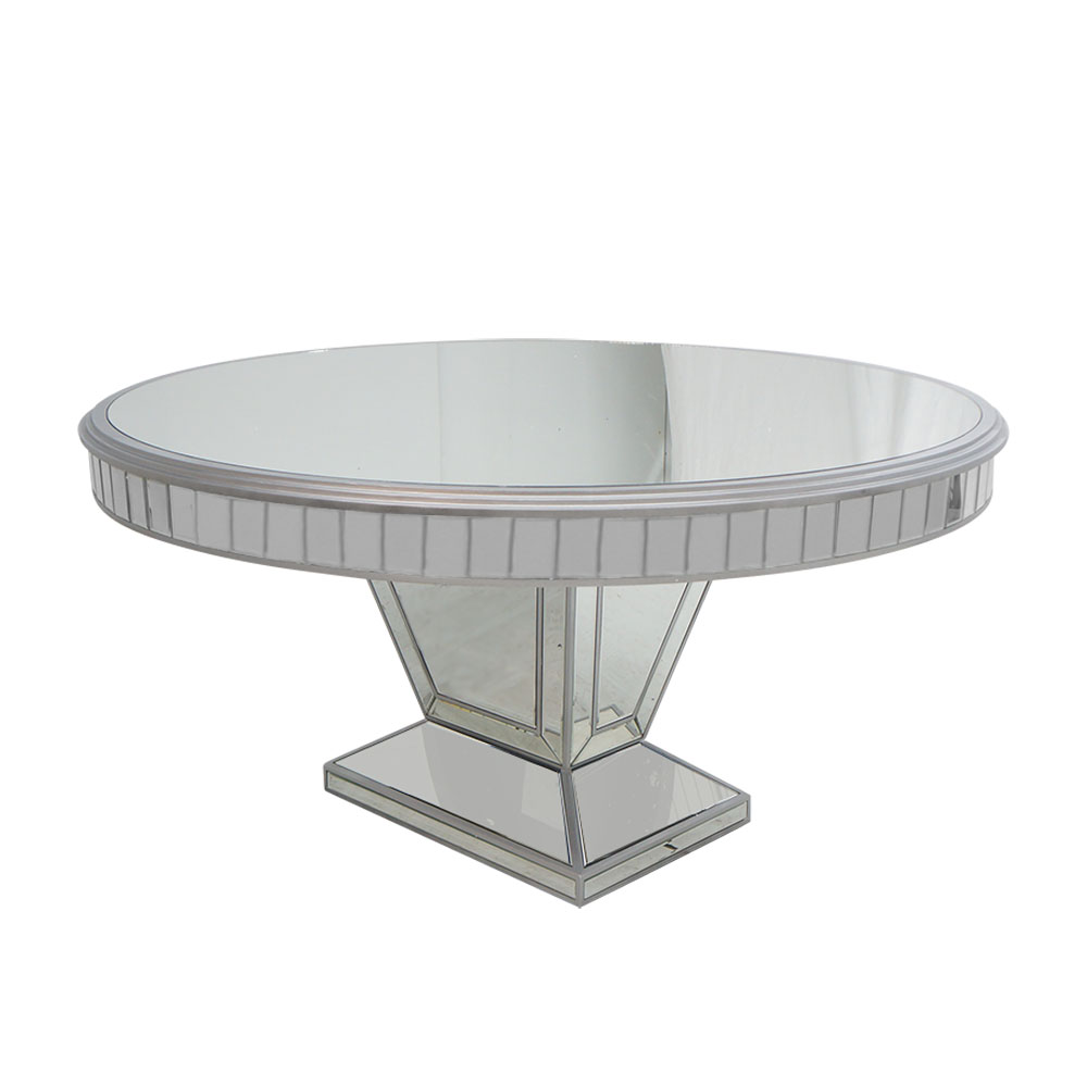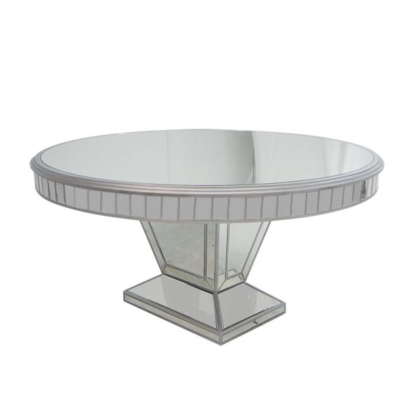 Illuminate your event with the Holder Dining Table. This all-mirror round table is inlaid with mirror tiles surrounding the tabletop. The smooth mirror top reflects the setting and magnificently displays what is upon it.