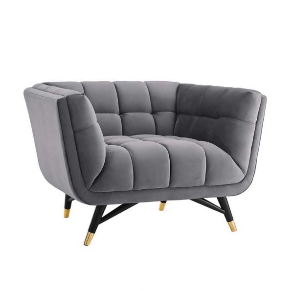 Sit back on this plush velvet Lexington Armchair Gray for a furnished and comfortable feel. Large cushiony square tufts cover the chair with a backrest continuing around the sides as armrests, resting on gold tipped black legs. Available in gray, ivory and sea blue and as sofas.