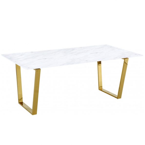 The Pacific Marble Dining Table, is not just a marble table. With a twist of modern style and class, this marble top table has striking, gold polished, stainless-steel bases. Its unique sled style legs and the quality marble top, make it a special table. Also available as a console table.