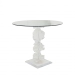 Dine by this ornate Raina Glass Dining Table and feel the extravagance. What makes this all-glass table so special is its intricate designed base. A supreme beveled glass tabletop is held upon an intricate step-design, twisted glass base. It decorates the room with glisten while serving as a table. Available in round cocktail, square cocktail and rectangle dining table.