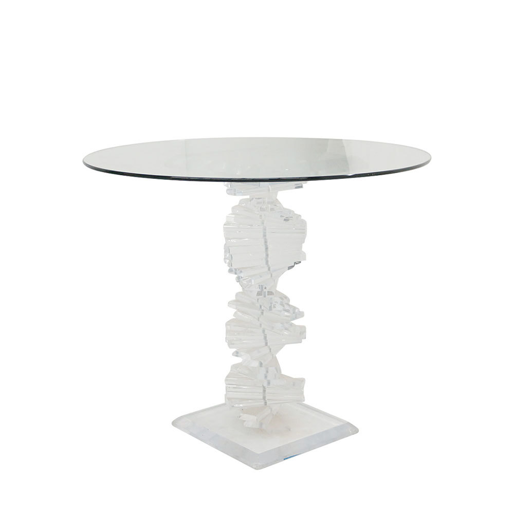 Dine by this ornate Raina Glass Cocktail Round and feel the extravagance. What makes this all-glass table so special is its intricate designed base. A supreme beveled glass tabletop is held upon an intricate step-design, twisted glass base. It decorates the room with glisten while serving as a table. Available in round cocktail, square cocktail and rectangle dining table.